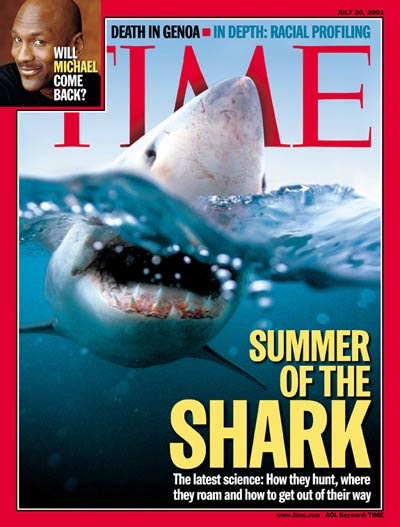 Michael Jordan the entertainer COON, does it again, being used for another false flag https://en.wikipedia.org/wiki/Summer_of_the_Shark… While Time Magazine printed on 7/30/2001, “The Summer of the Shark“ with Michael Jordan’s picture appearing the front cover with the caption “Will (Prince William in code) Michael Jordan Come Back”, it also had the caption “Death in Genoa: In Depth: Racial Profiling”, 1 month and 12 days later 9/11 happens, 112 = Zionist connection in gematria http://4.bp.blogspot.com/-kliJJDMWw3s/VBmq25yfsdI/AAAAAAAAa8U/tFTayGxPo1U/s1600/SummerofShark.jpg… Fast forward to 7/25/2016 Michael is at it again with Race and Violence… Get Its ready for another 9/11 style event in September…